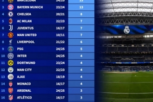 德转列欧冠改制后进入4强次数榜:皇马17次居首,巴萨、拜仁前三